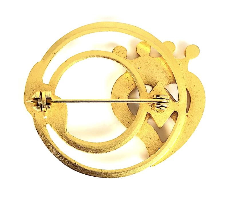 A very scarce vintage period 'Scottish Women's Rural Institutes brooch', fine quality original one piece ornate example in the form of a double hoop, with a heart device inlaid with white enamel and coronet, each orb bearing the initials 'SWRI', the voided centre with blue chevron inscribed 'For Home & Country'. Very good condition, complete with original american style pin fittings with safety roller catch in good working order, no stress marks or damage to the enamel.
