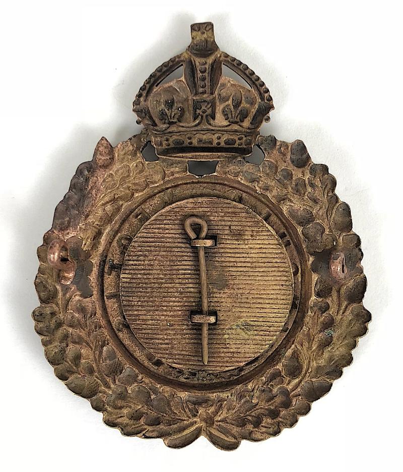 A scarce original pre 1940's period 'Isle of Wight Constabulary police officer helmet plate'; die-stamped blackened brass crowned oak wreath, 'Insula Vectis' circlet (Latin for Isle of Wight) white metal Carisbrooke Castle mounted to lined centre. Good used condition, complete with original two loop fittings and split pin, blackened finish worn back to brass.