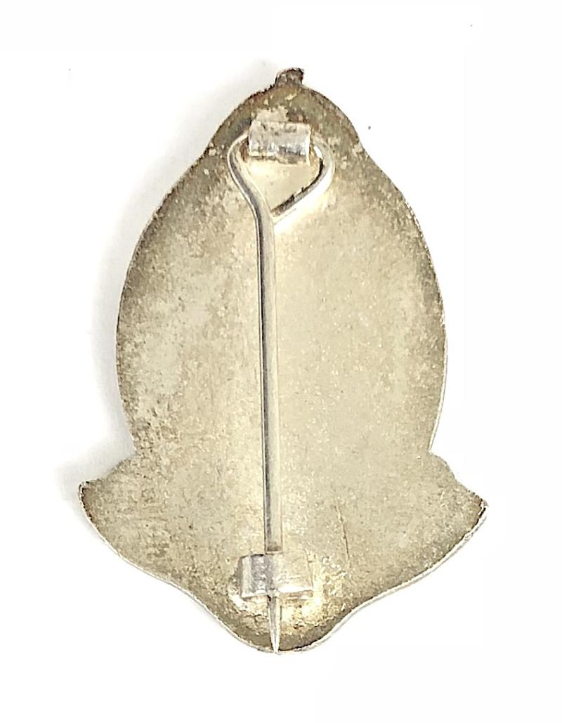 A scarce original 'King George VI' period 'Queen Alexandra's Royal Army Nursing Corps Association silver plated pin badge' inlaid with red enamel, the Dannebrog lettered 'A' for Alexandra, to the centre. Very good condition, complete with original pin fittings, no damage to the enamel.