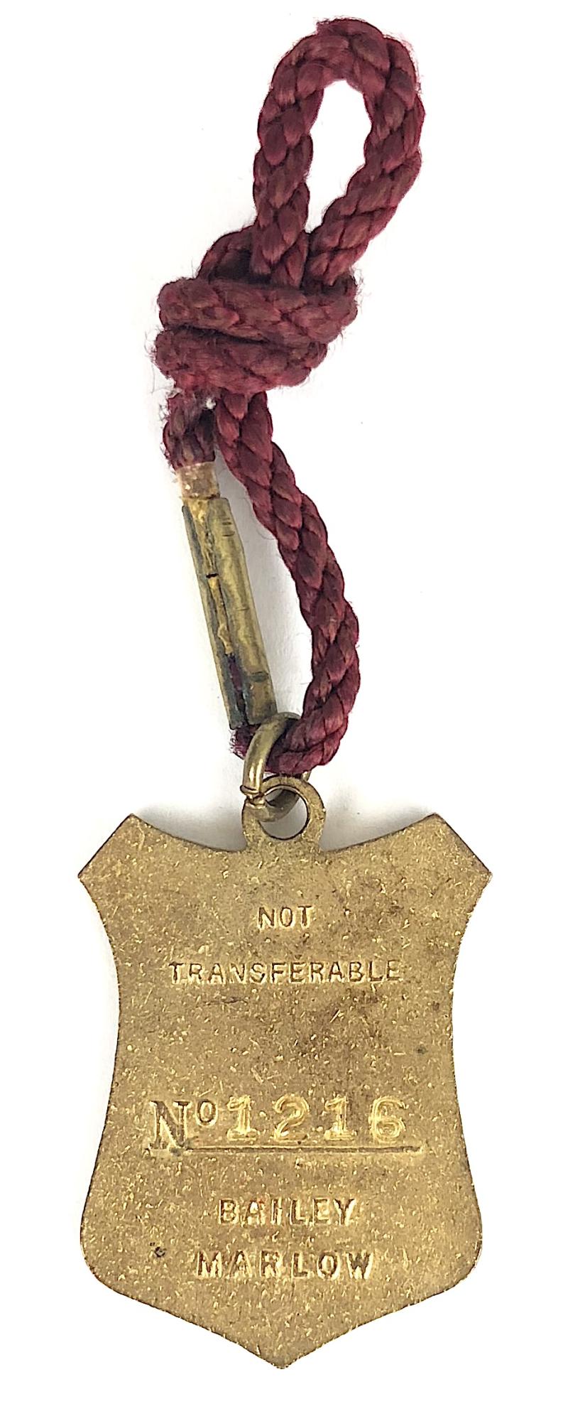 A scarce original '1967 Henley Royal Regatta gilt and enamel badge', the reverse with maker's details 'Bailey Marlow' 'Not Transferable' and impressed with official issue number '1216'. Very good condition, no damage to the enamel, complete with original cord.