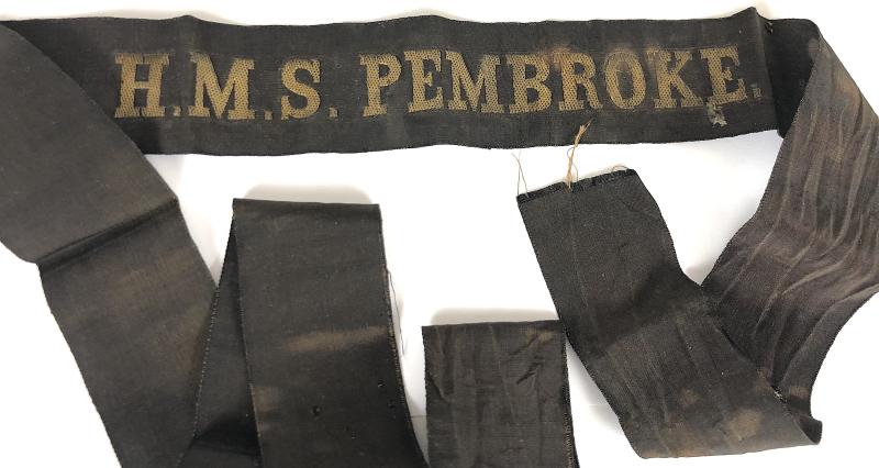 A good ORIGINAL pre 1939 period 'H.M.S. PEMBROKE gold wire embroidered on cotton ribbon bearing small dots. Good condition, straight ends, some service wear. Length approx 87mm. 34inches.