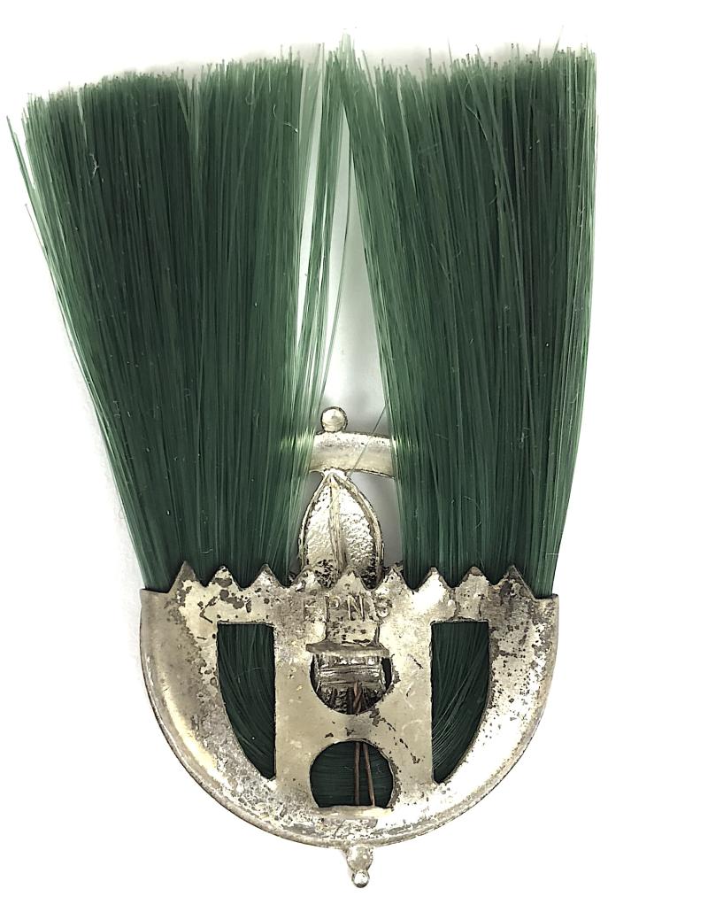 A scarce original circa 1937-1952 third pattern 'Scoutmaster Officer's hat badge', Electro Plated Nickel Silver arrowhead in circlet bearing 'Boy Scouts' motto scroll below; the reverse impressed 'E.P.N.S' within semi circle holder. Good condition, some service wear, complete with green nylon plume, correct amount of bobbles top and bottom and two flat loop fittings with split pin.