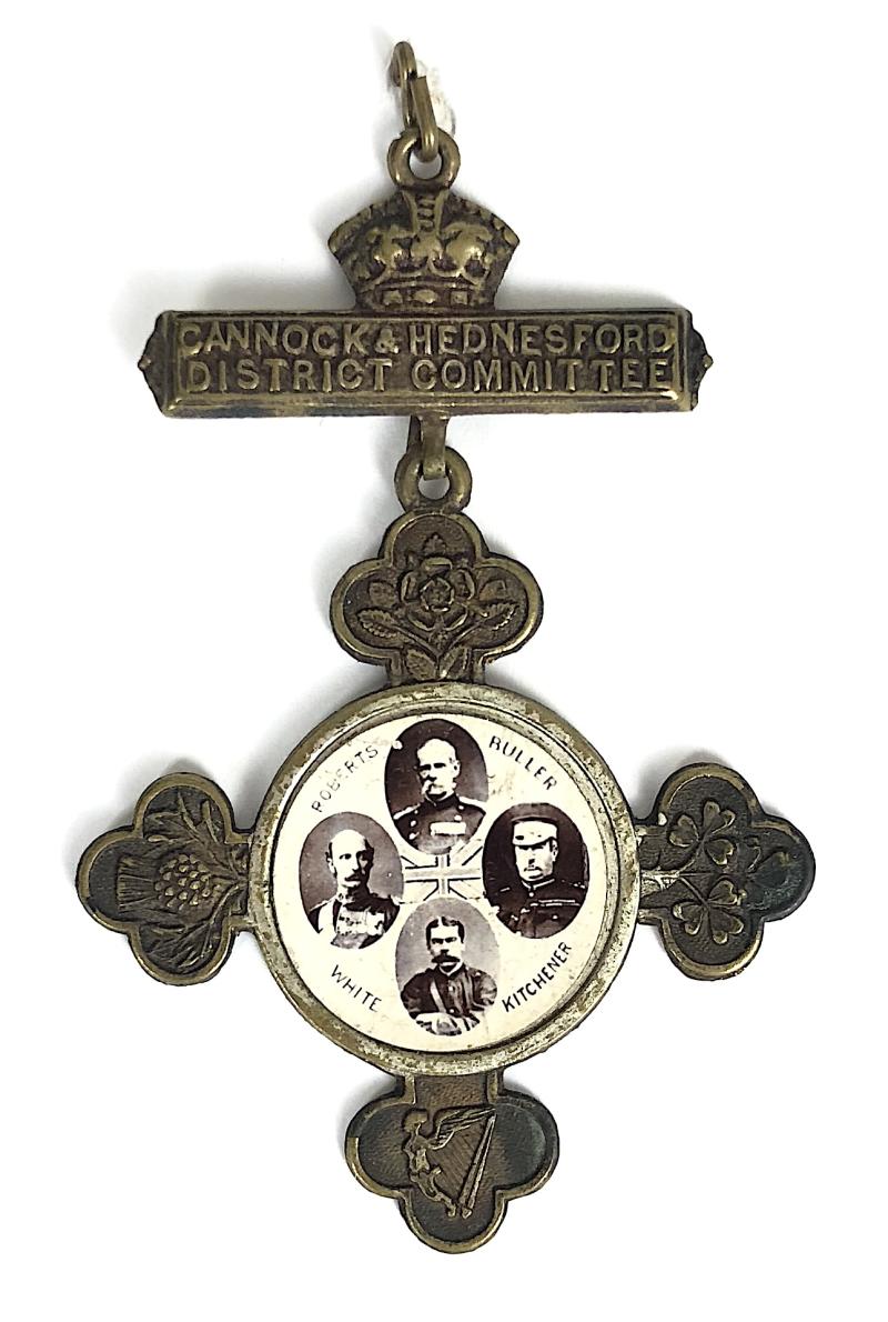 A scarce original circa 1900 period 'Channock & Hednesford District Committee Boer War Relief of Ladysmith Surrender of Cronje 1900 commemorative pressed white metal medal with maker's details 'FENWICK B'HAM' in the form of a cross, each arm impressed with a Rose, Maid of Erin, Thistle and Shamrock Spray; the central celluloid disc displaying four oval portraits of General Lord Roberts, Lord Kitchener, General Sir George Stewart White VC and General Buller; the reverse impressed in relief 'IN COMMEMORATION OF THE RELIEF OF LADYSMITH FEB. 28 SURRENDER OF CRONJE. 27. FEB. 1900'. Good condition, complete with original top suspension bar with single pin fitting.