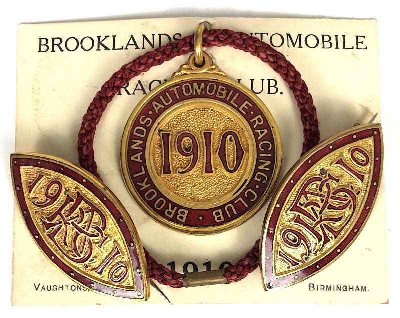 A rare original set of '1910 Brooklands Automobile Racing Club gilt and enamel gentlemens membership badge and matching guests, the reverse impressed with maker's details 'VAUGHTON B'HAM' and all with official issue number 'No 1293'. Very good condition, complete with original cord and pin fittings, no damage to the enamel, gilt fimish remains bright and housed in original card box with relevant details, this now with age wear and splits to each corner.