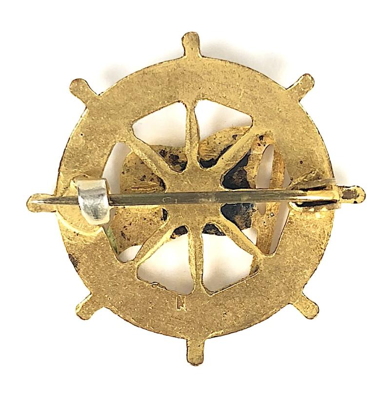 A scarce original circa 1931 to 1957 period 'M V Reina del Pacifico gilt and white enamel ships wheel badge' mounted to the centre with the companies blue and white enamel house flag; Very good condition, complete with original pin fittings, minor stress mark to wheel in 3 o'clock position not affecting the appearance, no enamel loss.