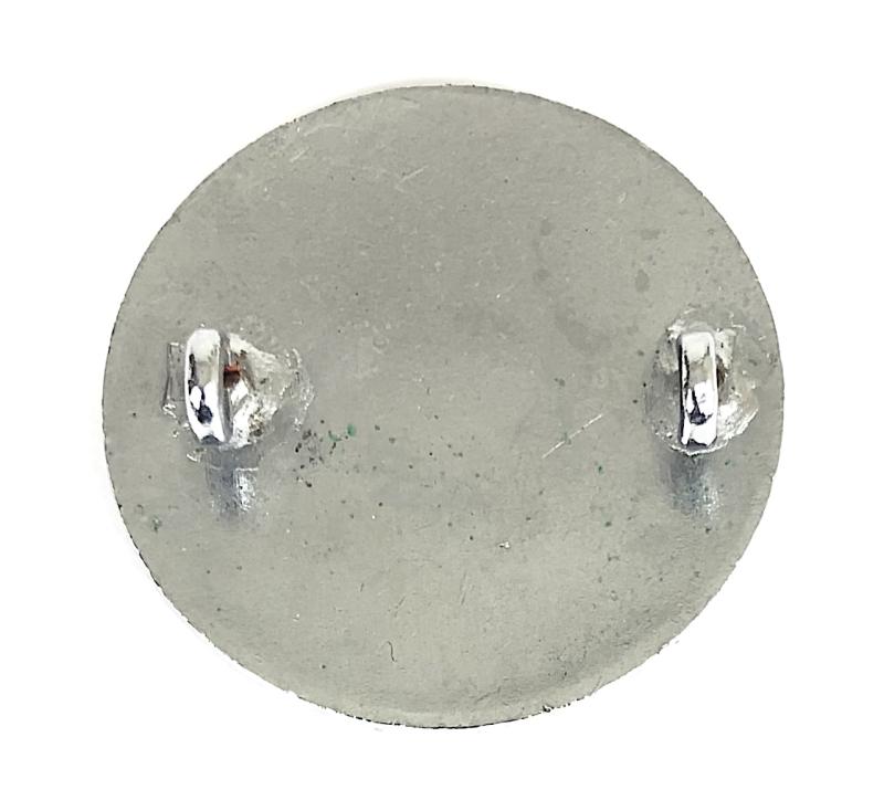 A good original late issue circa 1960's period 'Eastern Counties Omnibus Company Ltd cap badge'; chromium plated red enamel title circlet embossed single decker bus to centre on seeded ground. Very good condition, complete with original two loop fittings now slightly bent and split pin, no stress marks or enamel loss, light surface scratches only.