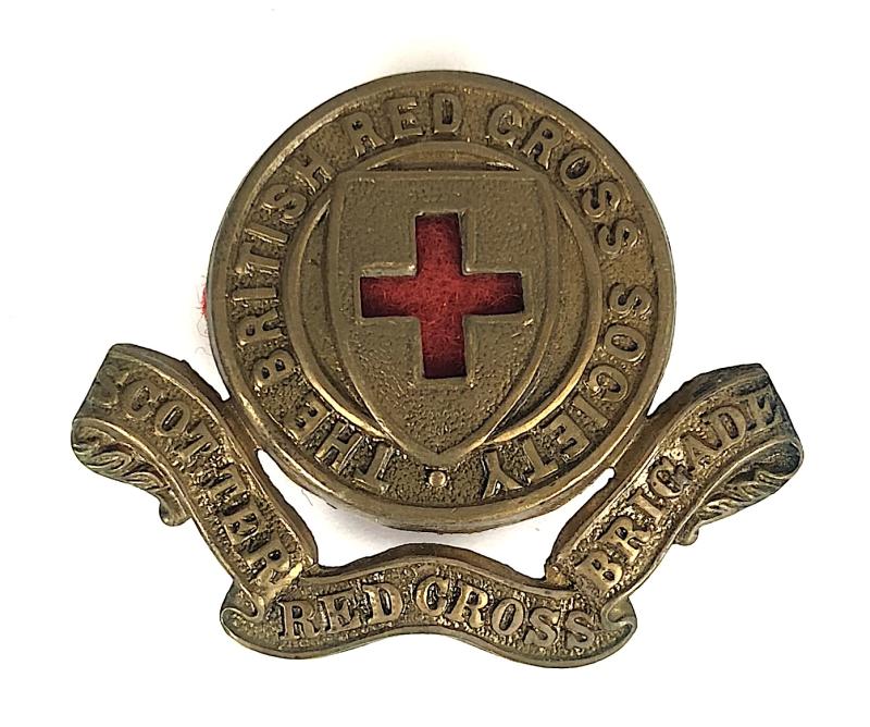A very scarce original short lived First World War period 'Scottish Territorial Red Cross Brigade cap badge'; die-stamped brass example bearing 'The British Red Cross Society' title circlet the central shield with voided 'Geneva Cross resting in tri-part scroll 'SCOT. TERR RED CROSS BRIGADE'. Very good condition, complete with original two loop fittings with split pin and red felt backing.