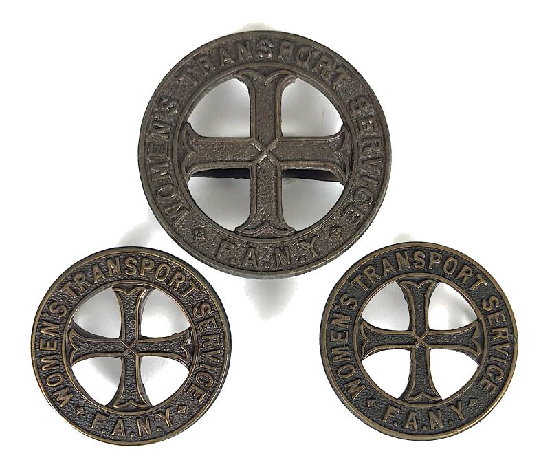 A scarce original Second World War period 'Women's Transport Service First Aid Nursing Yeomanry cap and matching collar badges'; die-cast bronze circular example on blades and loops, the reverse impressed with maker's details 'J.R.GAUNT LONDON'. Very good condition.
