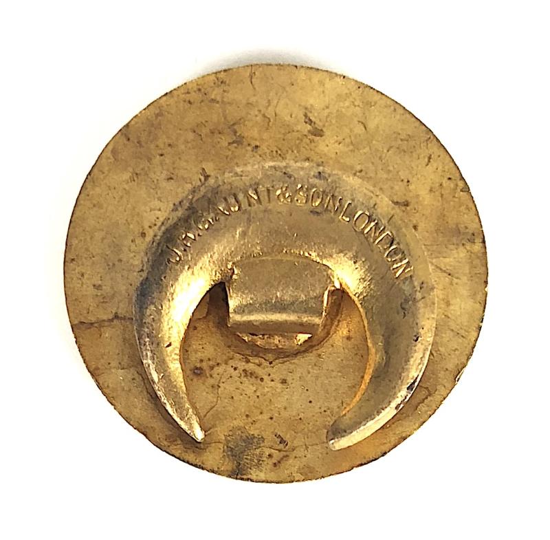 A scarce original First World War 'On War Service A.B. Hutchison 1915 badge', circular gilt brass example bearing yellow enamel title surround with company name to centre on green enamel ground; the reverse impressed with maker's details 'J.R.GAUNT & SON LONDON'. Very good condition, complete with original buttonhole lapel fitting, no damage to the enamel.