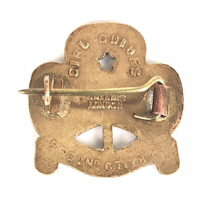A scarce original pre 1932 pattern 'Girl Guides Sea Ranger promise badge', brass trefoil inlaid with royal blue enamel bearing fretted star to the top leaf and plain scroll below, the reverse embossed with maker's details 'Collins London' 'Girl Guides' 'Regd No 671782' a registered, design and patent date of 1919. Very good condition, complete with original pin fittings, no damage to the enamel.