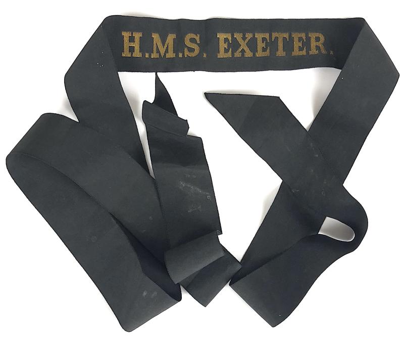 A rare ORIGINAL circa 1929 - 1939 period 'H.M.S. Exeter cap tally ribbon', gold bullion embroidered lettering with small dots on extra long silk ribbon. Very good condition.