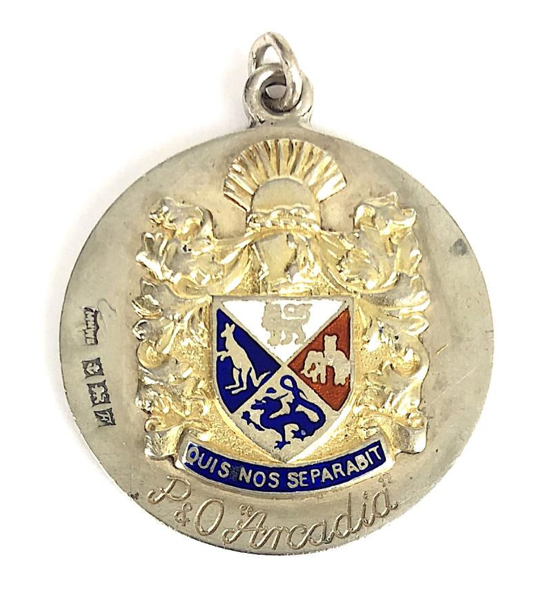A rare original finest quality 1950's period 'S.S. Arcadia impressive silver medallion' mounted with the Peninsular and Oriental Steam Navigation Company enamelled Coat of Arms, inscribed 'P&O ARCADIA, also bearing Birmingham silver hallmarks for 1955 and maker's details 'Mappin & Webb' (London & The Royal Works, Sheffield); the reverse with very unusual embossed 'St Christopher' patron saint of travellers. Very good condition, complete with original suspension ring, no damage to the enamel, an excellent example.