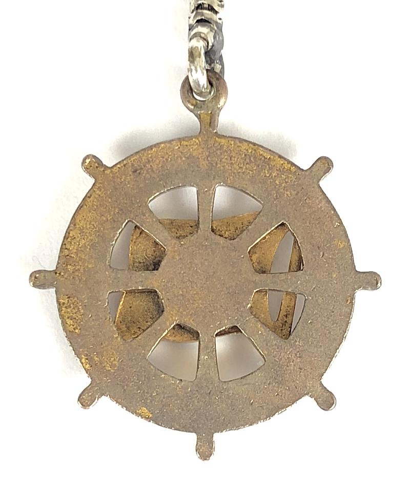 A scarce original vintage period 'United States Lines ship's wheel gilt and enamel pendant fob', white enamel example mounted with the United States Lines Company house flag to the centre, with later addition keyring chain and catch. Good condition, no damage to the enamel, minor service wear to gilt finish.