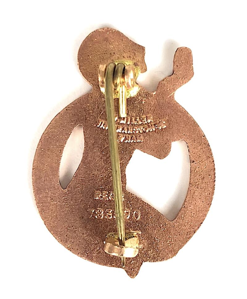 A scarce original early circa 1933 'Have You Ever Been Lonely, Have You Ever Been Blue, gilt and enamel advertising song badge', depicting a flapper with powder compact, wearing a red skimpy dress, within a horseshoe title surround; the reverse impressed with maker's details 'W.Miller 118 Branston St B'Ham 'Regd 783890' a registered, design and patent date of 1933. Very good condition, complete with original coiled pin fitting and hooked catch, no stress marks or damage to the enamel, gilt finish remains bright. An excellent example.