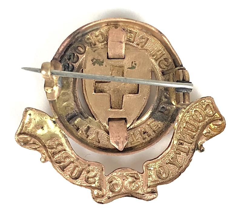A scarce original First World War period 'British Red Cross Society County of Surrey Detachment 36 cap badge'; gilt and enamel example the reverse with original two blade fittings replaced with period pin. Very good condition, no damage to enamel, gilt finish remains bright.