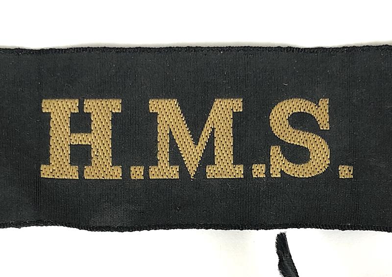 A good original circa Second World War period Royal Navy 'His Majesty's Ship' cap tally'; embroidery gold wire 'H.M.S.' on full length ribbon. Very good used condition. Length approx 95mm.