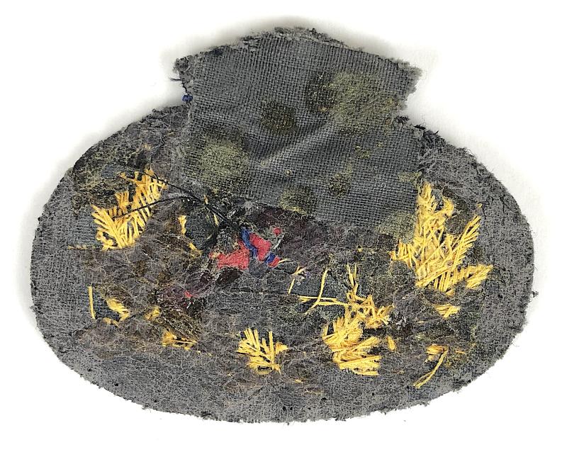 A scarce original circa 1960's period 'Mobil Oil Company Tanker Shipping Line embroidered cloth cap badge', large black felt example, the central flag displaying the company distinct trademark a Pegasus red winged horse, set within a gilt Merchant Naval Crown and a gold wire bullion wreath, the reverse with black hessian lining Good condition, bullion remains bright, minor service wear, evidence of stitch holes in lining.