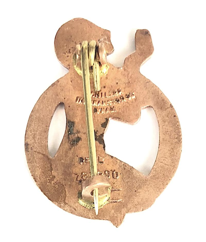 A good original circa 1933 period 'Have You Ever Been Lonely, Have You Ever Been Blue' gilt and enamel advertising song badge', depicting a flapper with powder compact, wearing a blue skimpy dress, within a horseshoe title surround; the reverse impressed with maker's details 'W.Miller 118 Branston St B'Ham Regd 783890'. Good condition, complete with original coiled pin fitting and hooked catch, minor stress marks to wrists, shoulder, waist, no enamel loss gilt finish remains bright.