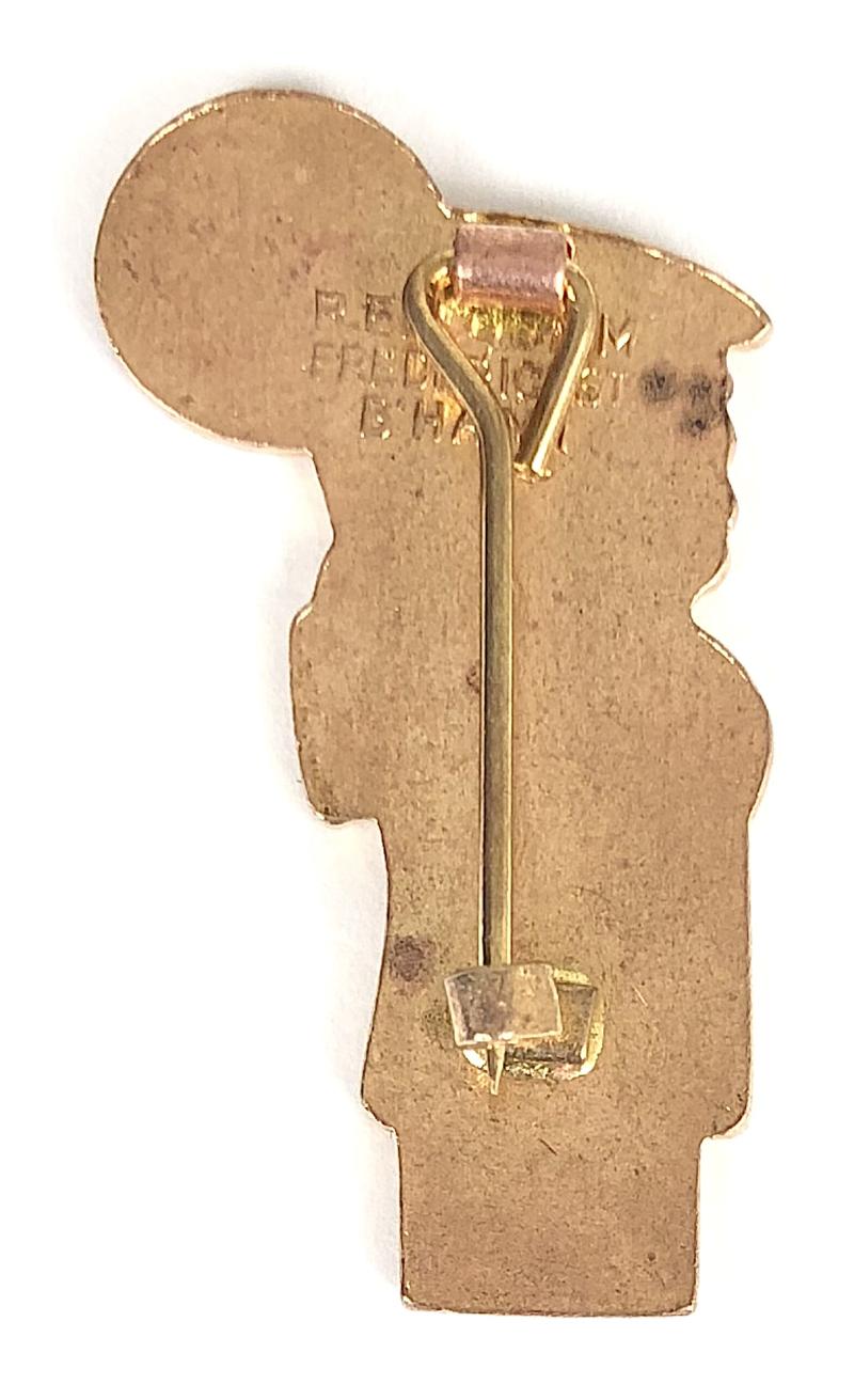 A good original circa 1970's vintage period 'Robertson's marmalades and Jam Golly lollipopman promotional pin badge', this example with notch in Stop Pole by face, wide line between legs and feet; the reverse impressed with maker's details in relief 'R.E.V.Gomm Frederick St B'ham1'. Very good condition, complete with original pin fittings, no stress marks or damage to the enamel.