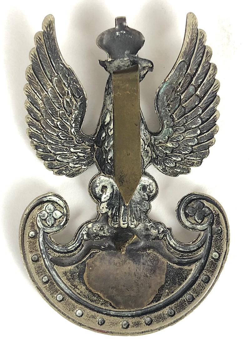 A scarce original Second World War period 'Free Forces Polish Eagle cap badge'; British made die-stamped white metal example in the form of a lightly domed Crowned eagle resting on Amazon Shield bearing thirteen nails, the reverse retaining just one of the two blade fittings otherwise very good condition.