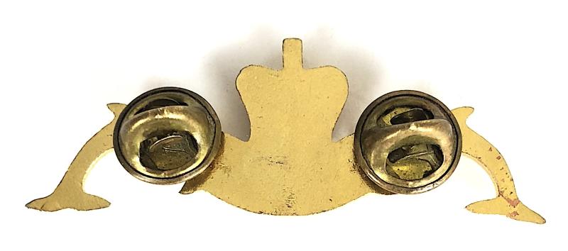 A good original post 1953 late period 'Royal Navy Submarine Service gilt and enamel badge'; full size Elizabeth II Crowned anchor, flanked by a pair of dolphins cresting. Very good used condition, complete with original pair of squeeze style clutch pin fittings, no damage to the enamel.