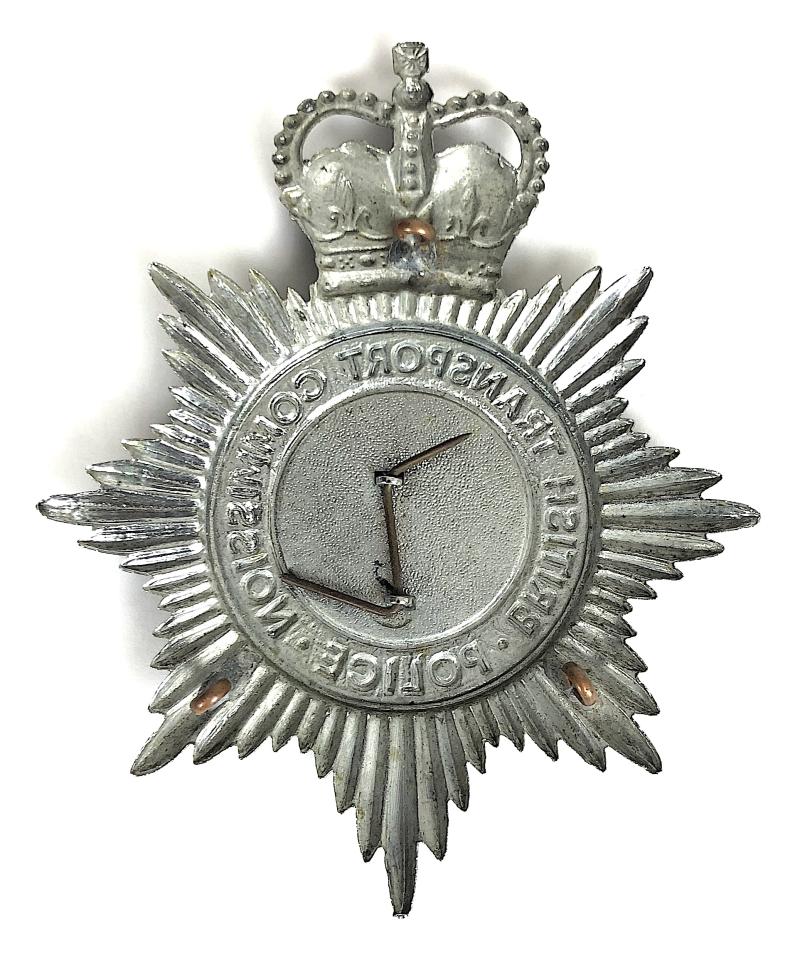 A scarce original post 1953 period 'British Transport Commission Police helmet plate badge' in the form of a die stamped blackened brass Queen Elizabeth crowned star, the centre with an applied chromium plated title circlet, the stippled centre mounted with Lion astride a wheel. Good condition, complete with original three loop fittings, minimal service wear.
