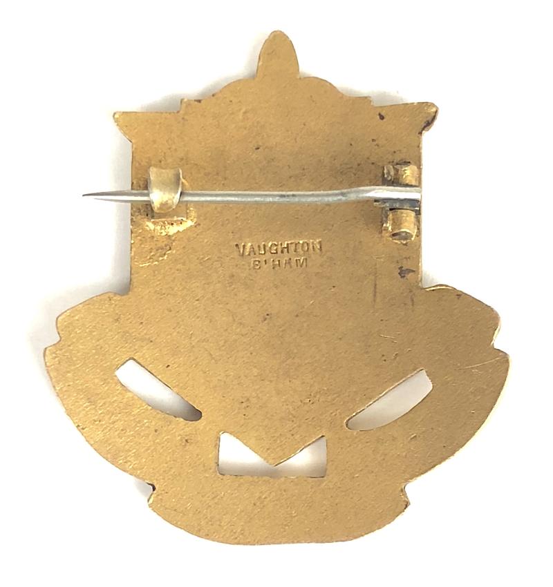A scarce original impressive early 20th century period 'Audley Cross Cycling Club pin badge'; large gilt brass blue enamel shield bearing red cross and troi part title scroll below; the reverse impressed with early maker's details 'Vaughton B'Ham'. The condition is very good apart from the ENAMEL LOSS to top right of the sheild (price reflects) complete with original pin fittings.