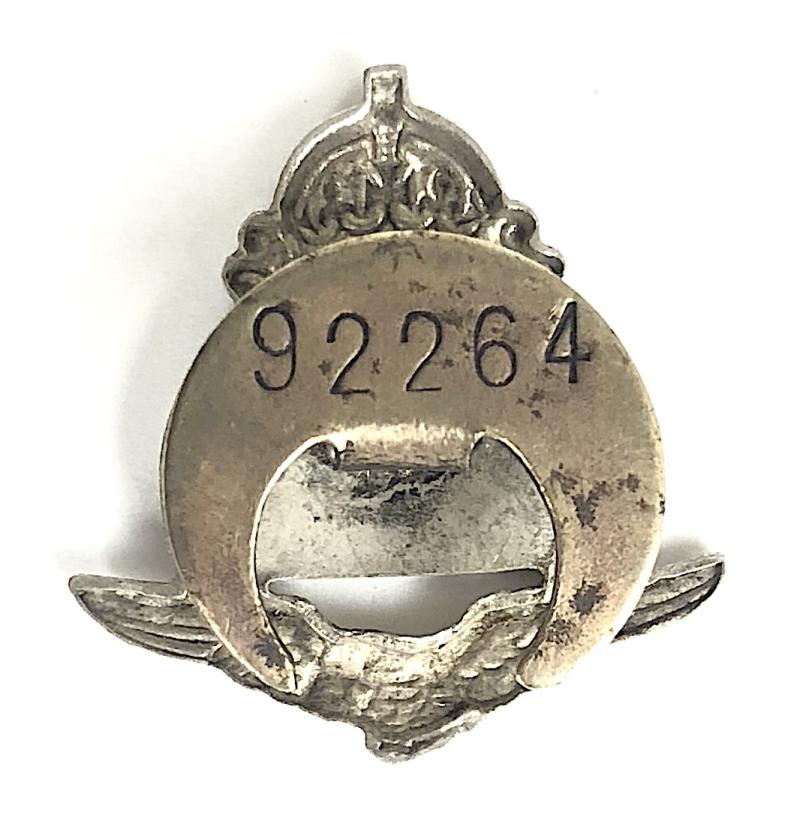 A scarce original Second World War period unmarked silver 'Royal Air Force Volunteer Reserve badge', made by the Royal Mint and impressed with official Air Ministry issue number '92264'. Very good condition, complete with original buttonhole fitting.