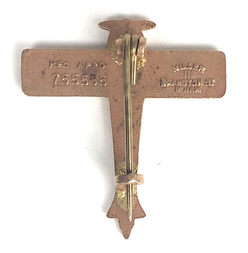 A scarce original circa 1930's period 'Amy Wonderful Amy advertising song badge' in the form of her pioneering aeroplane 'Jason' in gilt and dark blue enamel, the reverse impressed with maker's details 'Miller 118 Branston St B'Ham' and 'Reg 755555' a Registration, Design and Patent number for the year 1930. Very good condition, complete with original pin fittings, no stress marks or loss of enamel.