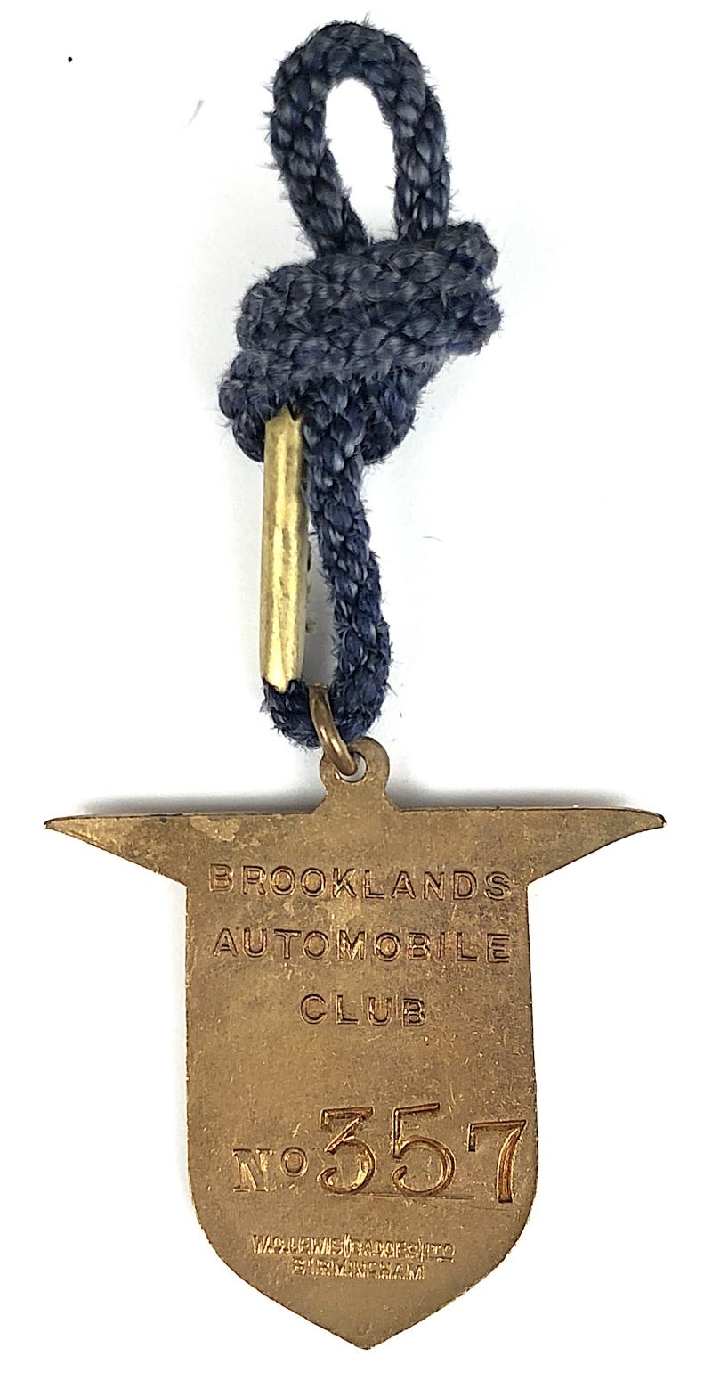 A very scarce original '1938 Brooklands Automobile Racing Club membership badge' depicting a racing car, the reverse impressed with maker's details 'W.O.LEWIS (BADGES) LTD BIRMINGHAM' and all with official issue number 'No 357'. Very good condition, complete with original cord, no stress marks or damage to the enamel, gilt fimish remains bright.
