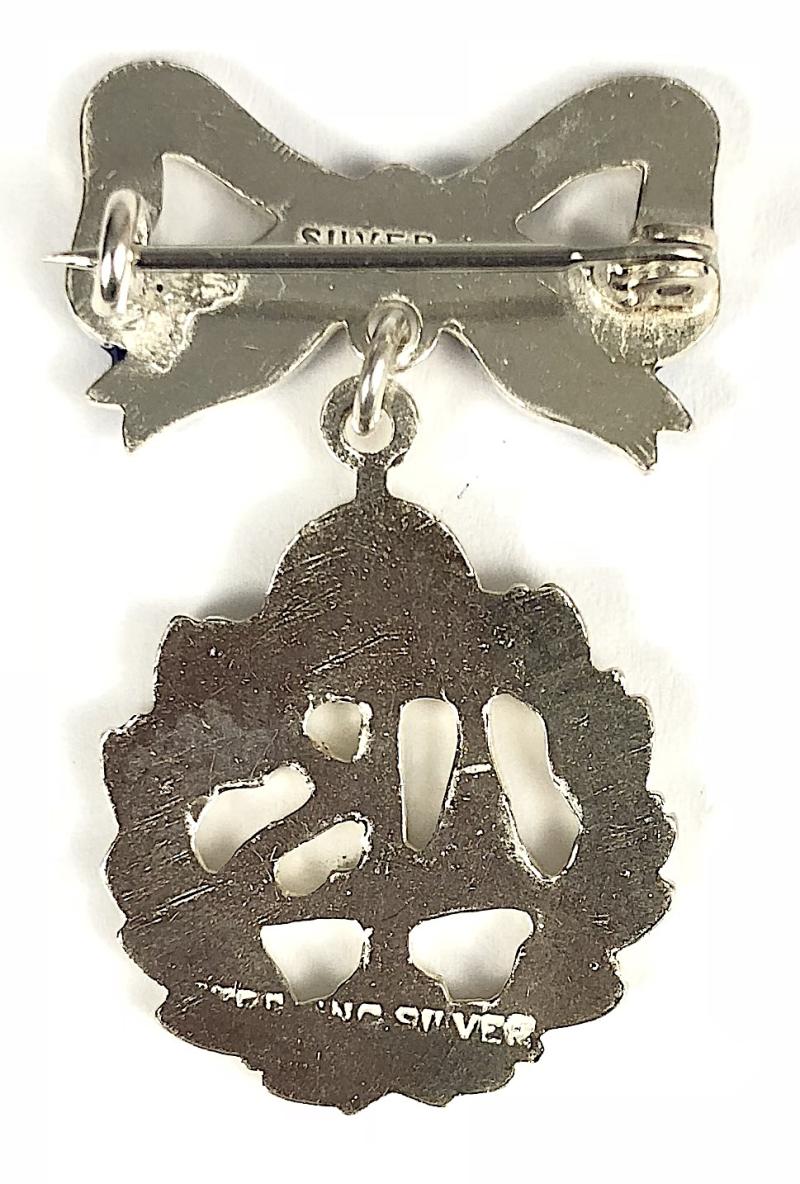 A beautiful original Second War period 'ATS sweetheart brooch', suspended from a vivid blue enamel bow so typical of the period, the reverse impressed 'Silver' to both parts. Very good condition, complete with original pin fittings, no stress marks or damage to the enamel.