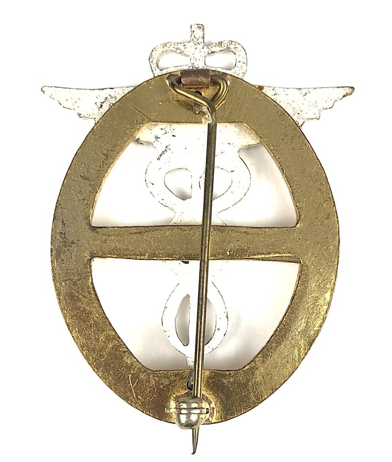 A good original EIIR period 'Princess Mary's Royal Air Force Nursing Service Wing Officer mess dress pin badge'; silver plated caduceus surmounted by a Queen's Crown mounted on an oval rank gilt backing. Very good condition, complete with original pin fitting incorporating safety roller catch in good working order, minor service wear.
