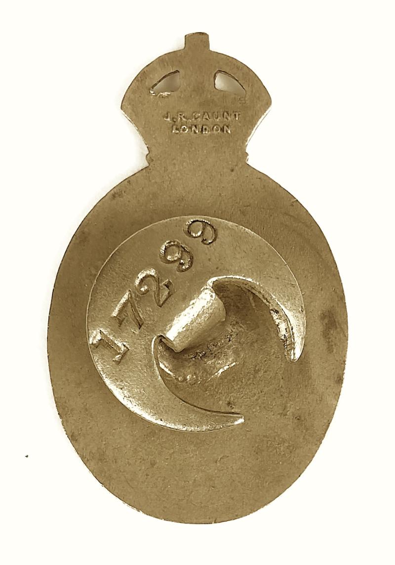 A scarce original First World War official issue 'On War Service 1915 munition workers badge', gilt brass Crowned blue enamel oval title, the centre bearing the 'Board of Ordnance' shield on white enamel ground, the reverse impressed with maker's details 'J.R.Gaunt London' and official issue number '17299'. Good condition, complete with original buttonhole fitting, no enamel loss, minor service wear.