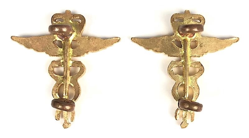 A good original Elizabeth II period 'Royal Air Force Medical Service matching collar badges'; gilt brass crowned winged Rod of Asclepius. Very good condition, each complete with original two loop fittings a split pins.
