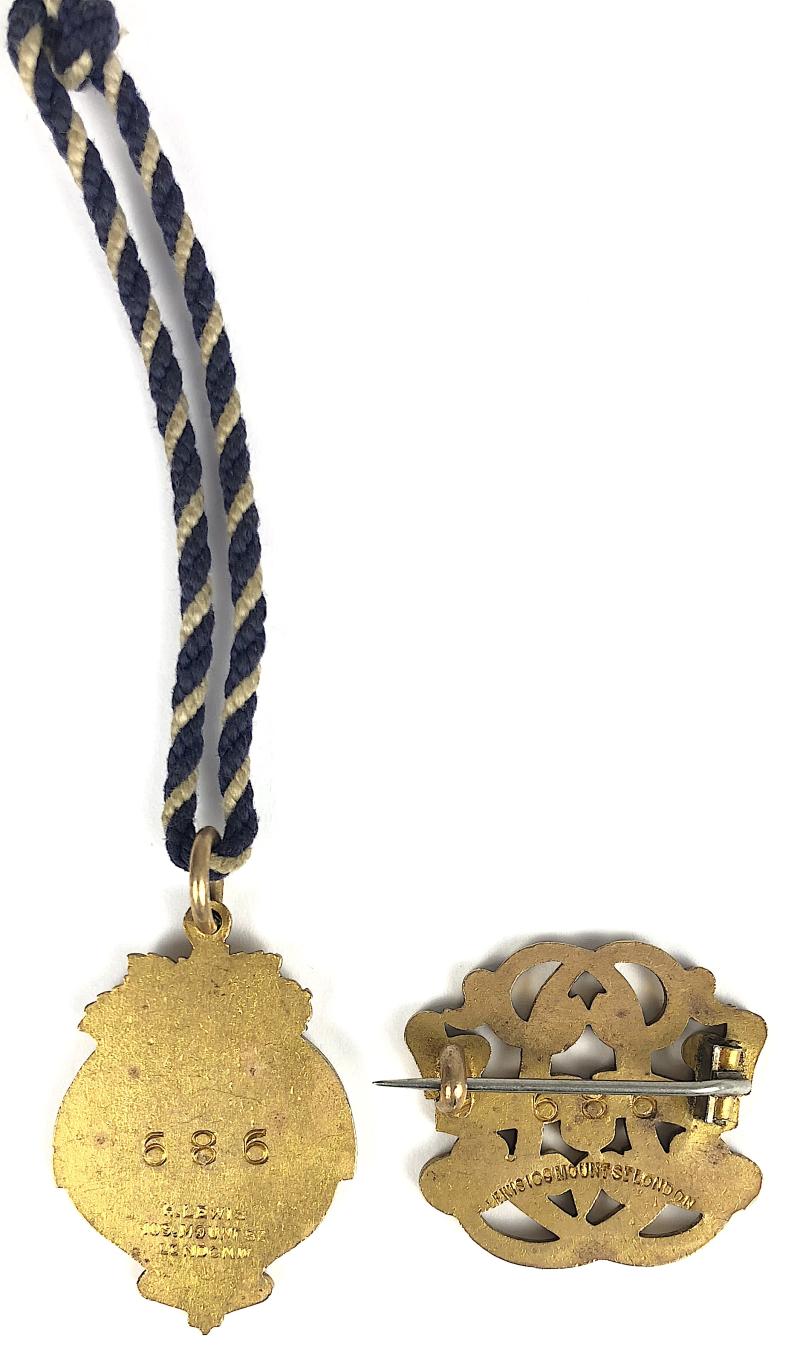 A very rare original Edwardian period ladies and gentlemens '1908 Lingfield Park horse racing club membership badges', the reverse with maker's details 'H.LEWIS 109 MOUNTSt. LONDON N.W' and both impressed with official issue number '686'. Very good condition, complete with pin fittings and blue and white cord knotted at the end, gilt finish remains bright.