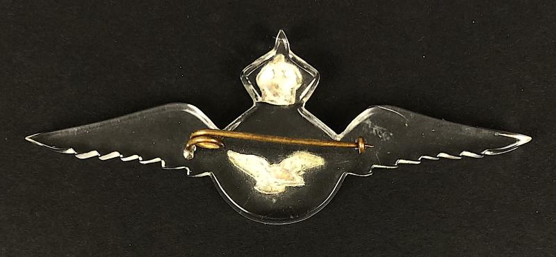 A scarce original Second World War period Royal Air Force workshop trench art pin badge, skillfully handcrafted from salvaged perspex from a fighter aircraft windscreens in the form of a pilots wing and sold to raise funds for the war effort. Very good condition, complete with pin fitting.