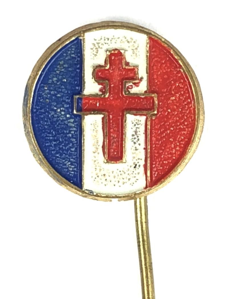 A scarce original circa Second World War period 'Free French supporters pin badge possibly for fundraising'; economically made small circular example, depicting the hand painted colours of the French flag and 'Cross of Lorraine'. Very good condition, complete with original single pin fittings, paintwork intact.