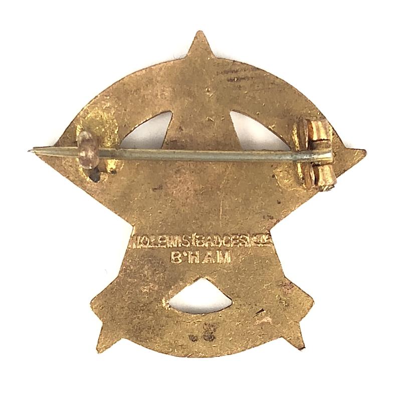 A scarce original 'Primrose League Beaconsfield Club pin badge'; gilt brass five pointed star inlaid with rich blue enamel 'Beaconsfield' rainbow title above, 'Club' below, yellow primrose flower to the center; the reverse with maker's details 'W.O.Lewis (Badges) Ltd B'Ham'. Very good condition, complete with original pin fittings, no stress marks or damage to the enamel.