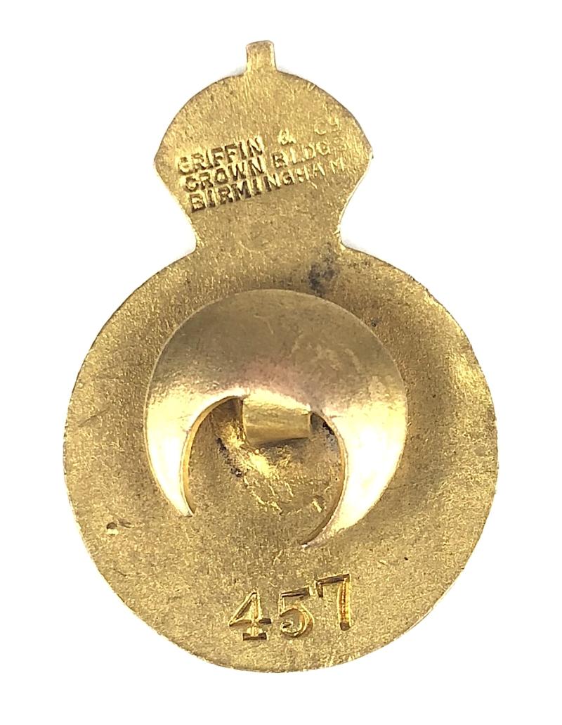 A rare original First World War period 'Harrow Local Defence Corps Attached To National Reserve badge', gilt brass Crowned white enamel title surround, embossed Harrow School Coat of Arms Lion to centre on seeded ground; the reverse impressed with unusual maker's details 'GRIFFIN & Co CROWN BLDG'S BIRMINGHAM' and official issue number '457'. Very good excellent condition, complete with original buttonhole fitting, no damage to the enamel, gilt finish remains bright.