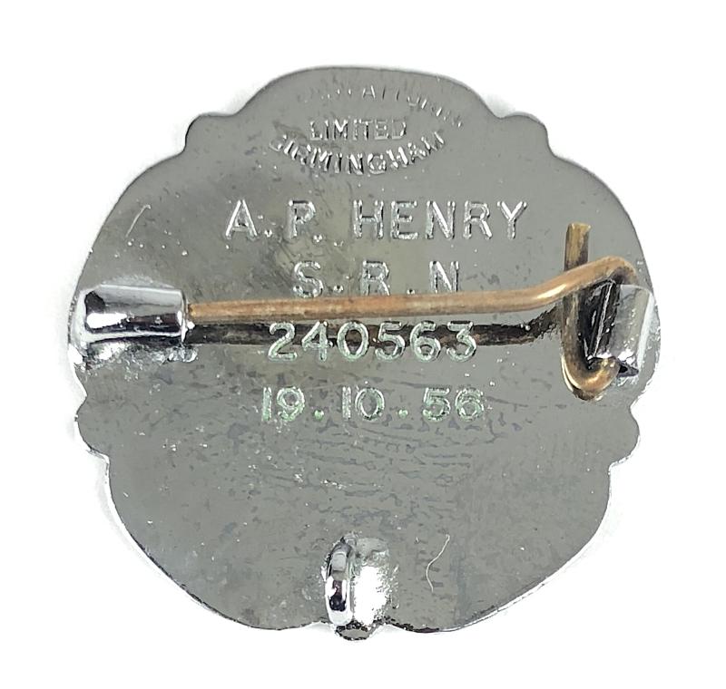A good original circa 1956 issue 'General Nursing Council For England & Wales State Registered Nurse chromium plated enamel pin badge', the reverse impressed with maker's details 'Thomas Fattorini Limited Birmingham' and awarded to 'A.P.HENRY S.R.N. 240563 19. 10. 56'. Very good clean condition, complete with original pin fittings, no damage to the enamel.