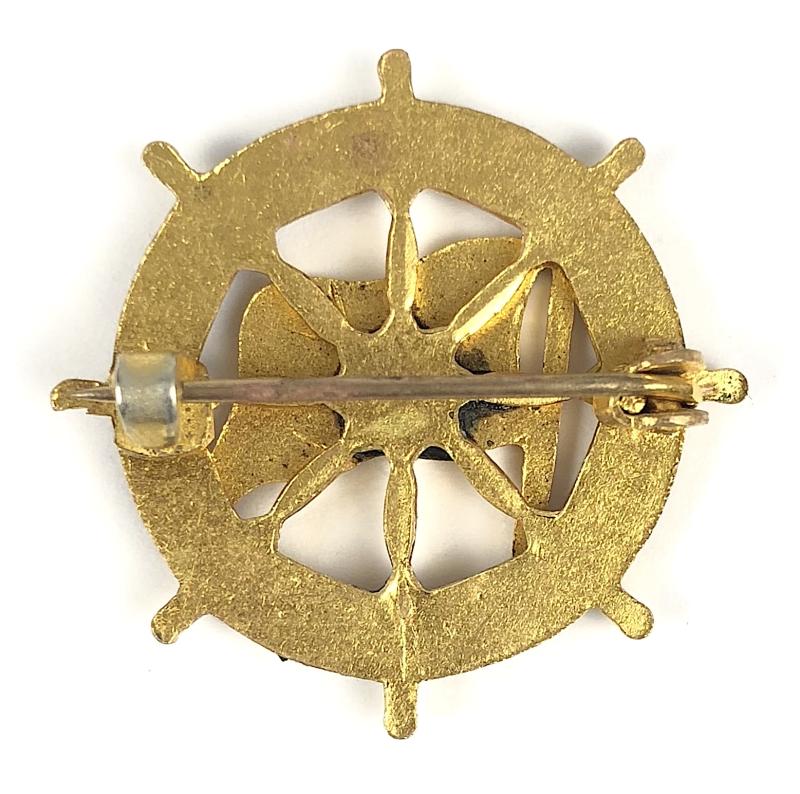 An exceptionally good circa post 1935 period 'S.S.Orion Shipping Line gilt and enamel pin brooch', the 'Orient Steam Navigation Company' enamelled house flag mounted to the centre of a ship's wheel. Very good condition, complete with original pin fittings, no damage to the enamel, gilt finish remains crisp.