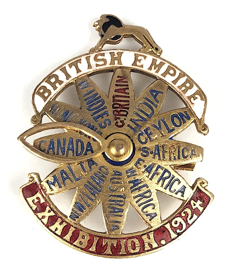 A scarce original 1924 period '1924 British Empire Exhibition pin badge on original display card' large gilt brass example inlaid with red, white and blue enamels, in the form of a flower head, depicting the names of the Colonies from around the world participating in the exhibition in petal form with rotating hand as a pointer, mounted by the 'Wembley Lion' resting on curved top scroll 'British Empire' with 'Exhibition 1924' below; the reverse impressed with details in relief 'Prov.Patent No 8418/24'. Very good condition, complete with original pin fittings, minimal damage to the enamel, gilt finish remains bright.