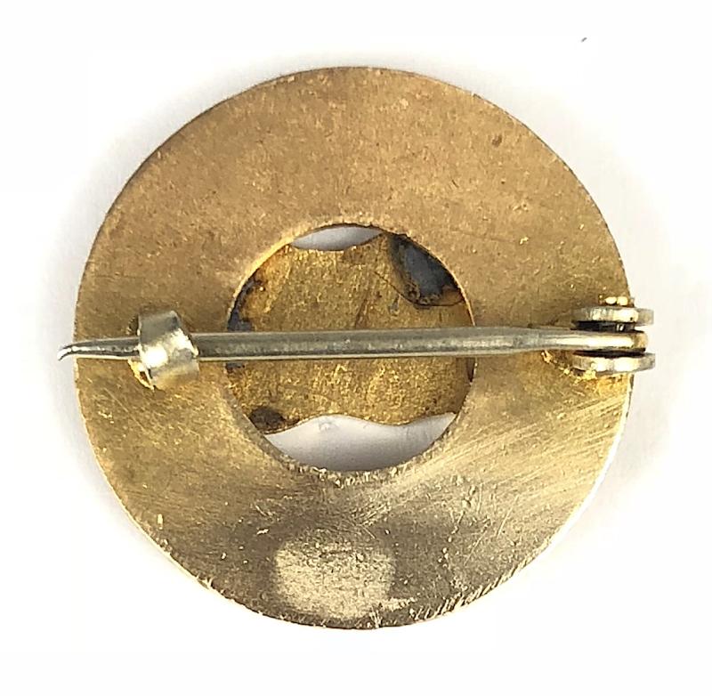 A very scarce original early 20th century 'RMS Otranto gilt and enamel pin brooch', the 'Orient Steam Navigation Company' enamelled flag mounted to the centre of an early rope edge ship's bouy. Very good condition, complete with original pin fittings, no damage to the enamel.