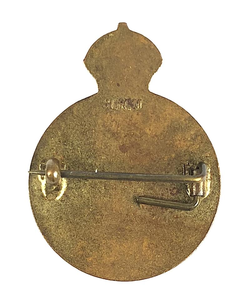 A scarce ORIGINAL Second World War period fine quality 'Womens Land Army' gilt brass badge inlaid with green enamel to central wheatsheaf and red to the Crown, the reverse impressed with maker's details 'H.W.M' (H.W. Miller Ltd Birmingham). Good condition, complete with original pin fittings, no stress marks or damage to the enamel, gilt finish now toned.