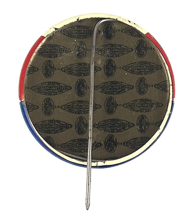 A good original Second World War period 'July 18 - 26 1942 Minneapolis Aquatennial Sponsor pin badge' large patriotic red, white and blue tin button example depicting three figures representing the United States Armed Forces and titled 'ON TO VICTORY'; the reverse bearing multi 'Trade Council' markings. Good condition, complete with original pin fitting, colours remain bright, minor age wear.