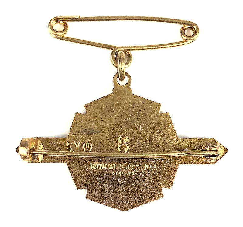 A scarce original '1966 to 1967 Plumpton Racecourse horse racing club gilt and enamel badge'; the reverse impressed with maker's details 'W.O.Lewis (Badges) Ltd B'Ham' and official low issue number '8'. Very good condition, complete with both sets of pin fittings, no stress marks or enamel loss, gilt finish remains bright.