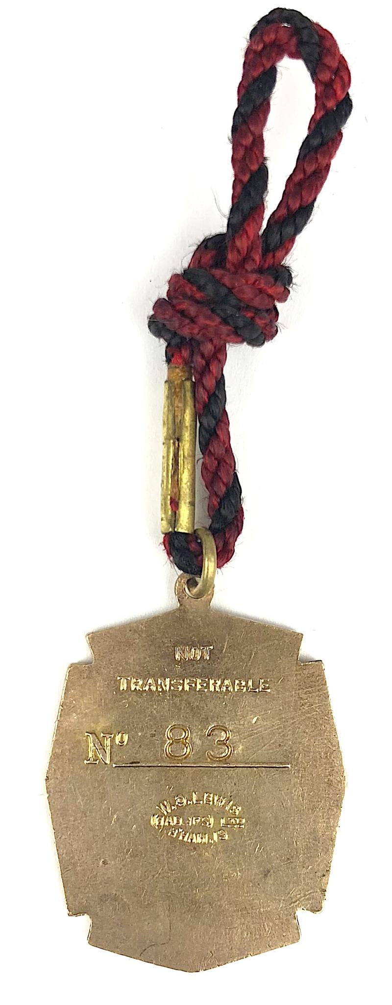 A scarce original '1966 to 1967 Plumpton Racecourse horse racing club gentlemans gilt and enamel badge'; the reverse impressed with maker's details 'W.O.Lewis (Badges) Ltd B'Ham 19' and official issue number '83'. Very good condition, no stress marks or enamel loss and complete with original cord
