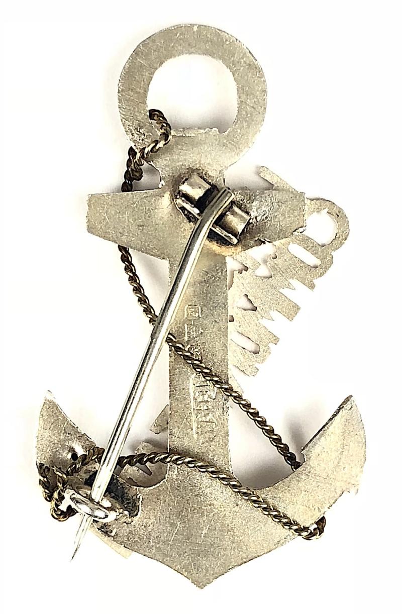 A scarce original First World War period 'HMS Commonwealth anchor sweetheart brooch' in the form of an ornate hollow silver anchor, bearing the Battleship's gold plated name across the centre; the reverse impressed with Chester silver hallmarks for 1915 and maker's details 'W.H.L' (William Henry Leather Birmingham).Very good condition, complete with original pin fittings, gold plating intact, no dents or distortions.