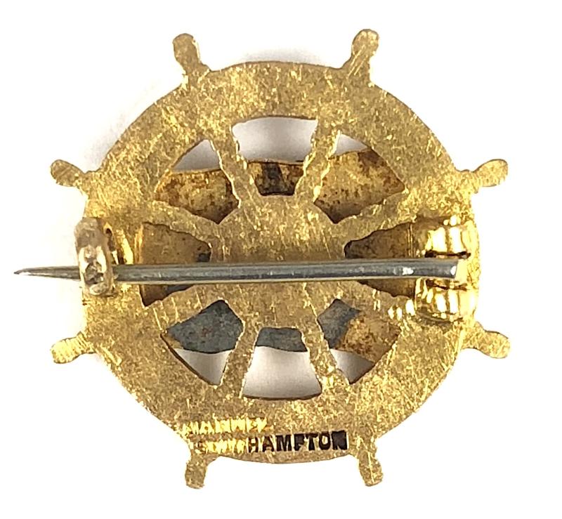A good original circa 1940's period fine quality 'Union-Castle Shipping Line small gilt pin brooch', the Union-Castle Line company enamelled flag mounted to the centre of a pale blue enamel ship's wheel; the reverse impressed with maker's details 'Emanual Southampton'. Very good condition, complete with original pin fittings, enamel perfect.