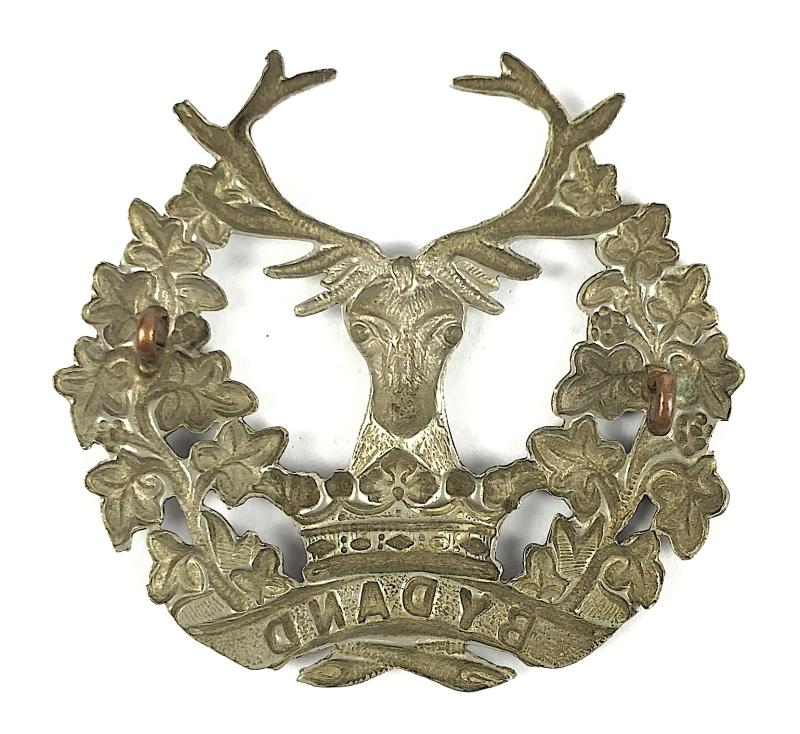 A good original large die-stamped white metal Stag's head issuing from a ducal coronet within an ivy wreath bearing 'BYDAND' motto ribbon scroll below. Very good fine detailed condition, complete with two original loop fittings and split pin.